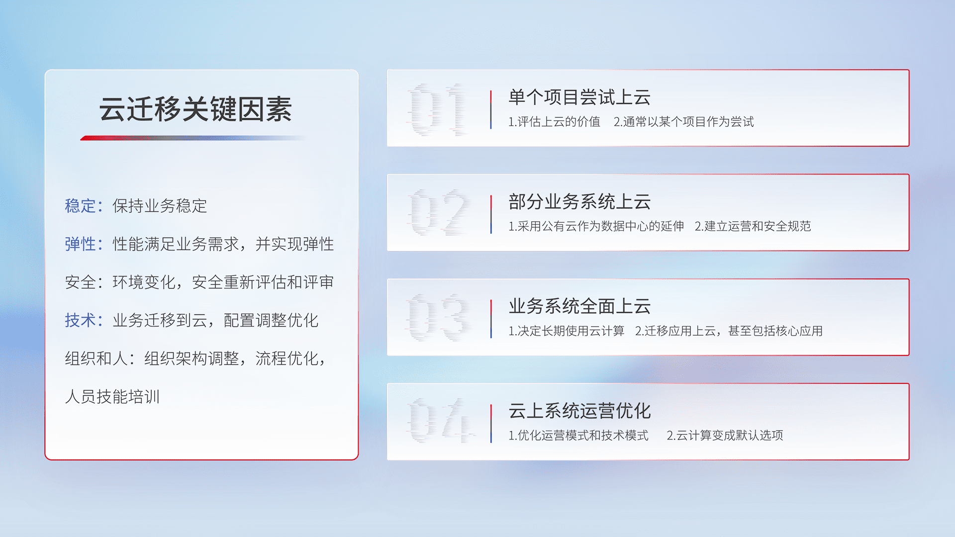 结合实际业务,,从规划设计、、、云平台选型、、云原生改造、、、、数据迁移、、、、集成交付,,,,迁移全过程为客户识别最佳上云路径,,,做好风险识别管理,,设计网络架构、、身份权限、、安全审计合规、、操作审计、、、日志审计、、、、监控告警策略、、、多站点容灾设计等,,,对云上基础设施进行整体规划,,提升IT治理水平,,以满足弹性、、高可用、、、、高性能的需求。。。。