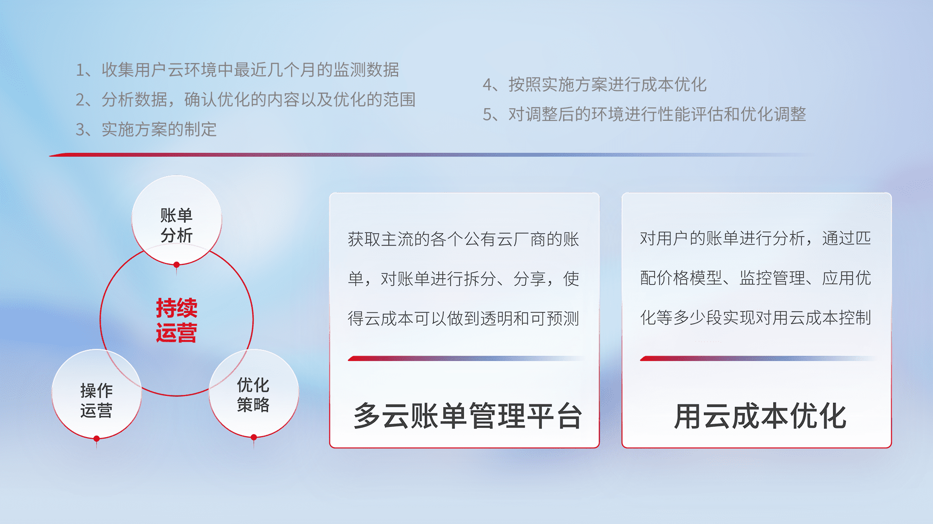 通过多云纳管,,,,以统一的资源数据模型把客户的云资源进行抽象和封装,,进而实现对多云资源的统一操作,,,保障云资源管理的可靠性、、、稳定性与可用性。。。。量身定制化运维内容,,配置、、、、开发运维、、补丁管理、、、、备份、、监控、、、认证和访问管理、、、、审计和日常巡检等,,,,保障在用云过程中的可靠度,,,稳定度以及高可用率。。。